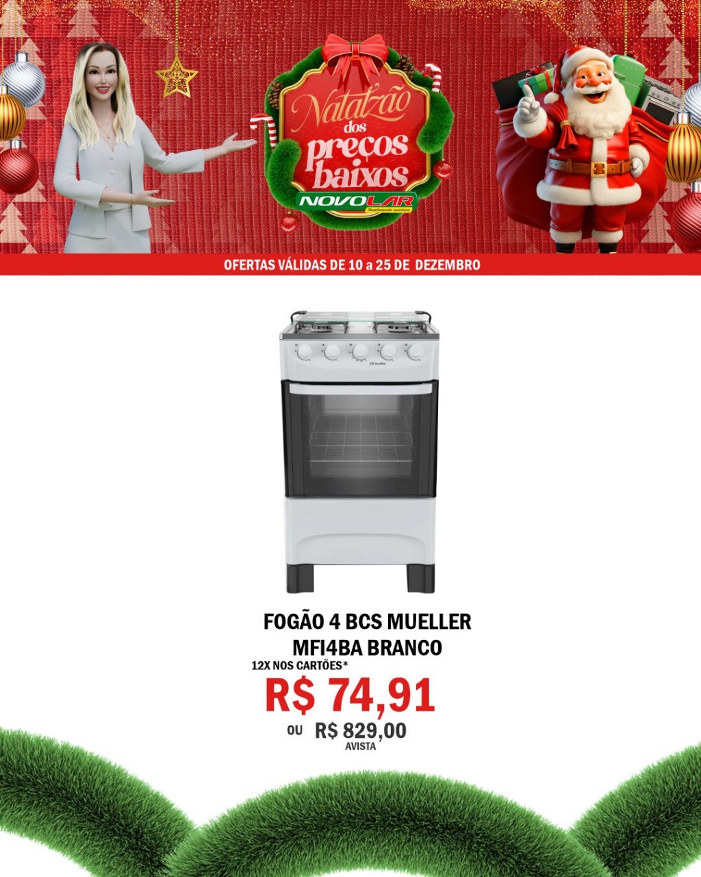 Fogão Mueller de 4 bocas, modelo MFI4BA na cor branca. Possui acendimento automático, forno com visor panorâmico e queimadores eficientes.