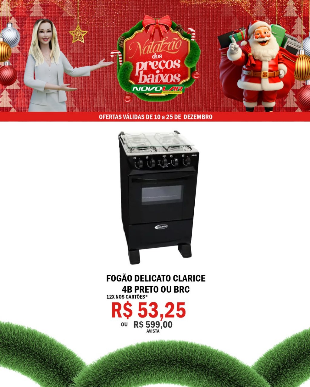 Fogão Clarice modelo Delicato de 4 bocas, disponível em preto ou branco. Mesa de aço inox e forno limpa fácil com visor amplo.