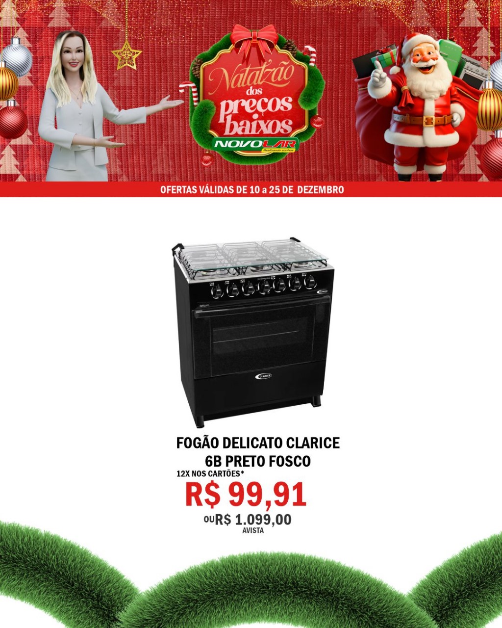 Fogão Clarice Delicato de 6 bocas com acabamento preto fosco. Mesa de aço inox e forno espaçoso, ideal para famílias grandes.