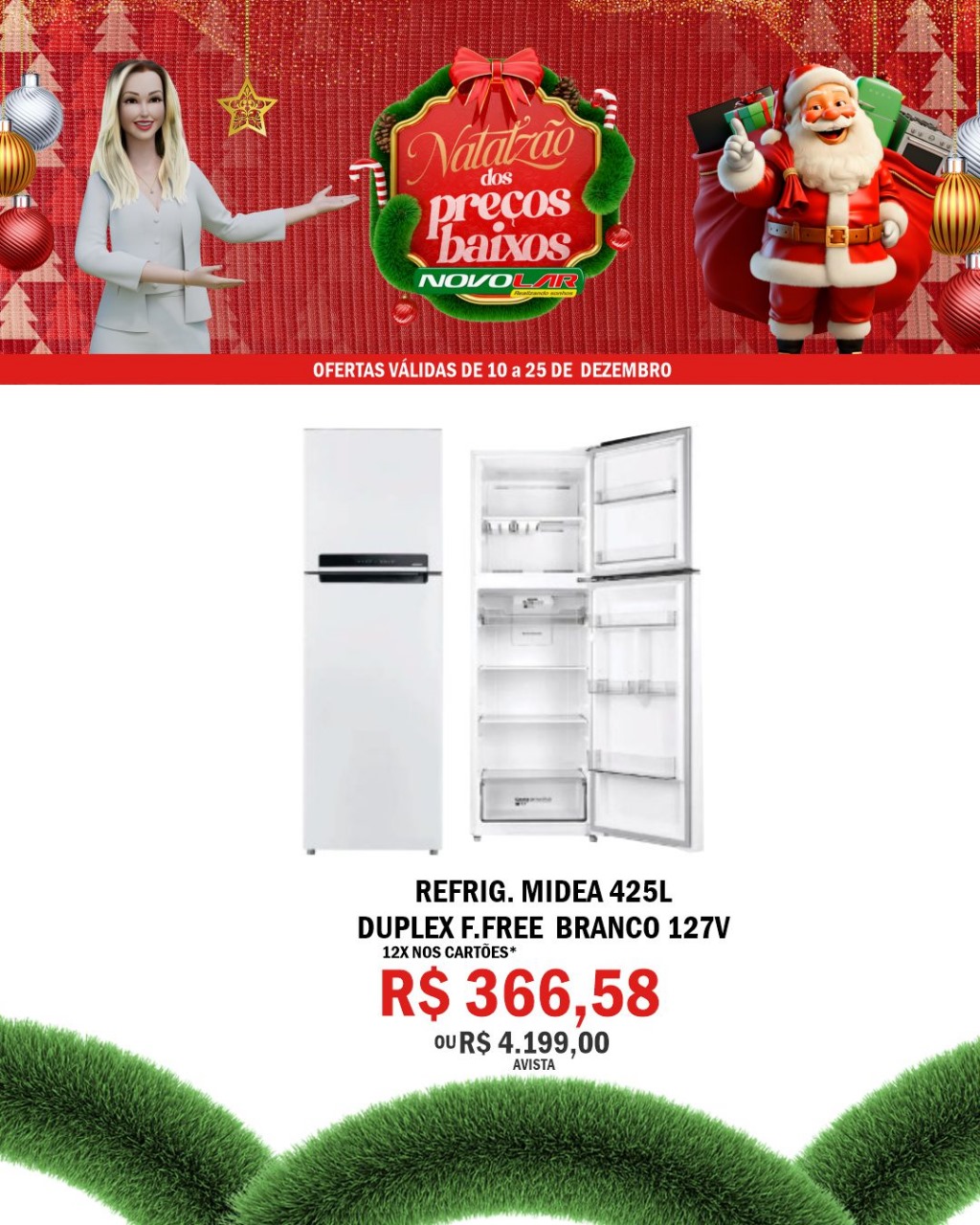Refrigerador Midea de 425 litros com design moderno na cor branca, ideal para quem busca capacidade e tecnologia. Modelo Duplex Frost Free 127V com prateleiras de vidro.